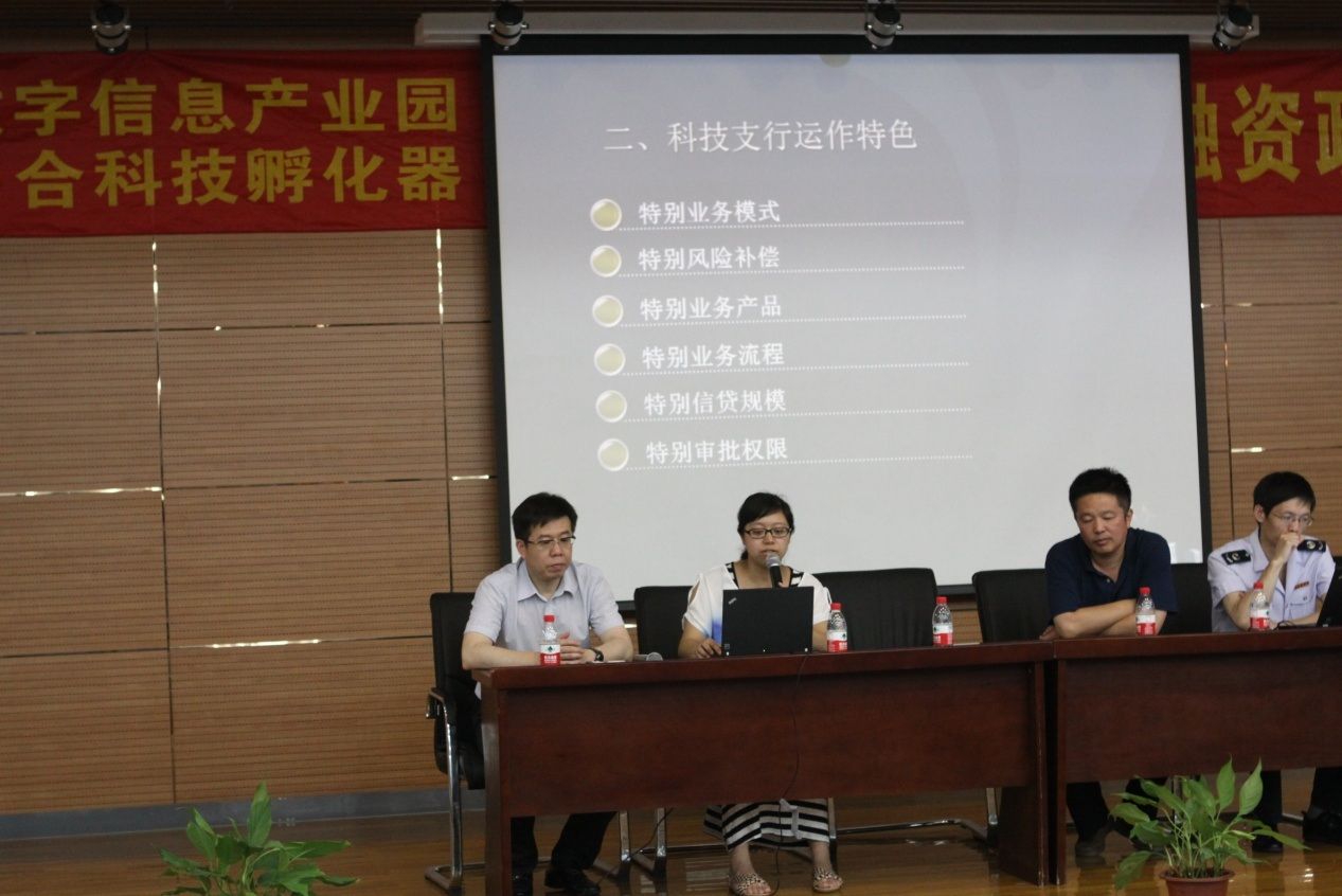 首先,江蘇銀行無錫惠山支行沈龍華行長和江蘇銀行無錫科技支行宗亮副行長分別對園區初創型、成長型等各類科技企業貸款優惠政策進行了解讀。科發擔保公司業務經理秦迪則向大家介紹了江蘇銀行無錫惠山支行、江蘇數字信息產業園、科發擔保公司三家單位具體的業務合作模式。據悉,為了更好的服務于“千人計劃”等科技型初創企業以及“八大戰略新興產業”客戶,江蘇銀行成立了服務于科技型中小企業的專營金融機構——無錫科技支行。