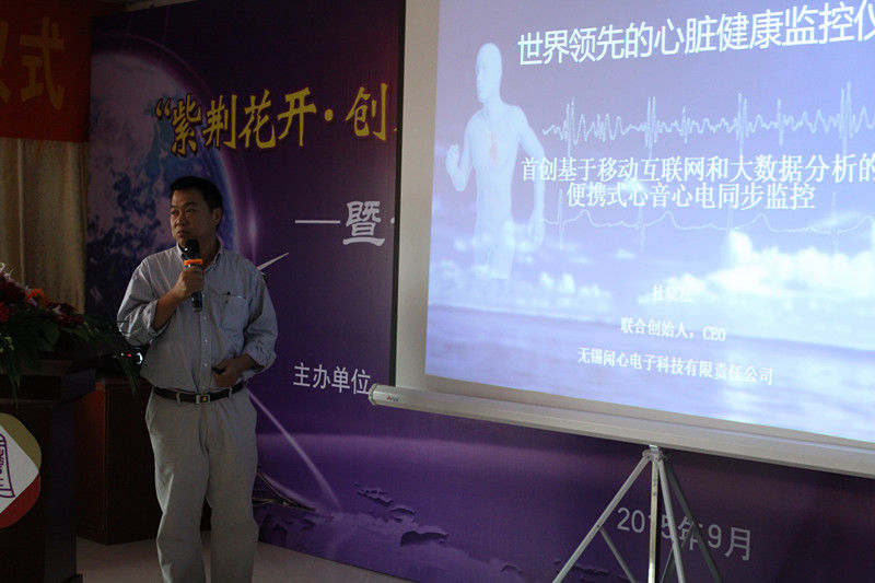 在簡潔的開班介紹后,3個代表創客項目無錫聞心電子科技有限公司、無錫烯旺新材料科技有限公司、搬磚網分別進行項目路演,各導師對其進行點評指導。其中,聞心電子運用先進傳感器技術,全球首創引入心音心電分析系統,首發產品“基于移動互聯網和大數據分析的便攜式心音心電同步監控儀”可以快速預警心臟衰竭,心肌梗塞等多種疾病。