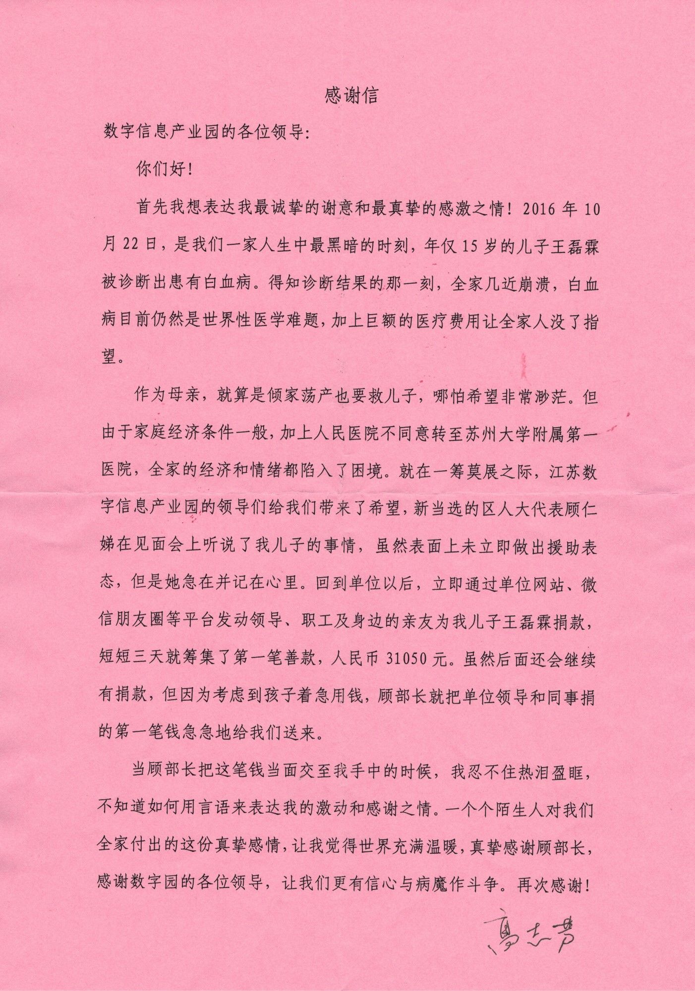 11月28日惠山區(qū)人大代表選民代表見面會(huì)上,數(shù)字園人大代表候選人顧仁娣女士得知王磊霖的病情以及艱難的家庭情況,立即通過動(dòng)員公司職工,并通過微信朋友圈等平臺(tái)為王磊霖同學(xué)捐款。園區(qū)領(lǐng)導(dǎo)非常關(guān)心王磊霖同學(xué)的病情,第一時(shí)間進(jìn)行捐款,短短三天便籌得善款31050元,送到了王磊霖媽媽的手中。特此王媽媽給數(shù)字園送上一份感謝信,感謝顧部長(zhǎng),感謝數(shù)字園。