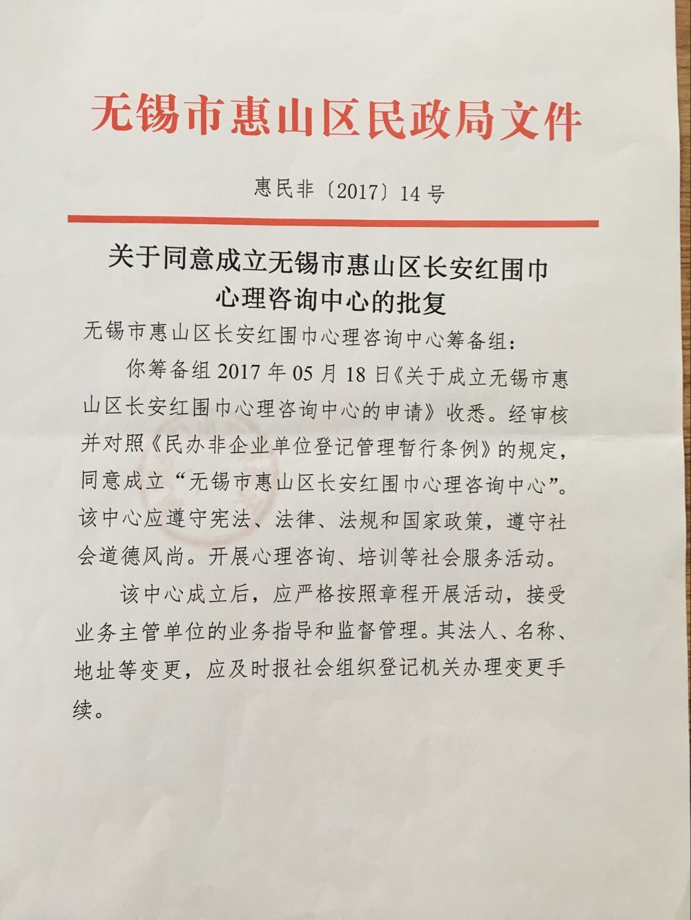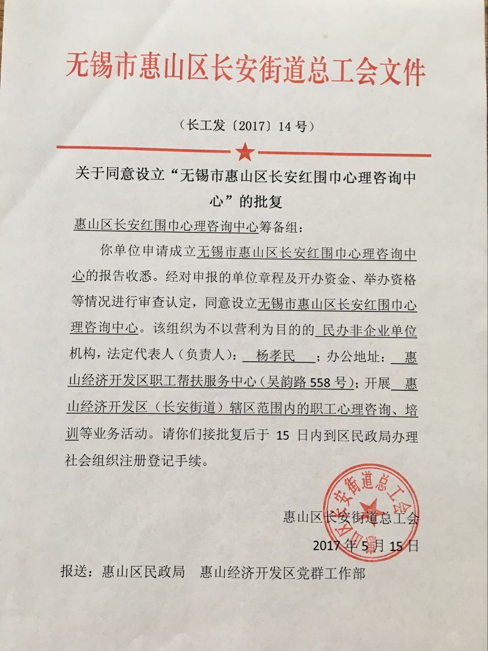 為了更好為園區(qū)乃至開發(fā)區(qū)創(chuàng)業(yè)企業(yè)服務(wù),園區(qū)精心打造了企業(yè)EAP服務(wù)平臺,經(jīng)惠山經(jīng)濟(jì)開發(fā)區(qū)(長安街道)總工會(長工發(fā)【2014】14號)批準(zhǔn),惠山區(qū)民政局(惠民非【2014】14號)注冊登記設(shè)立“無錫市惠山區(qū)長安紅圍巾心理咨詢中心”。