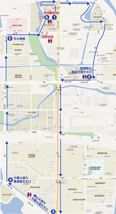 線路安排如下:起點(diǎn)①(無(wú)錫(惠山)生命科技產(chǎn)業(yè)園→致遠(yuǎn)路→啟航路→研園路→荷塘路→華清創(chuàng)業(yè)園(荷塘路與力合路交叉口)→荷塘路與智慧路交叉口→智慧路與堰新路交叉口→智慧路(0-Park)→站點(diǎn)②數(shù)字信息產(chǎn)業(yè)園(智慧路與政和大道交叉口)→政和大道→政和大道與惠山大道交叉口(地鐵1號(hào)線)→惠山大道→惠山大道與金惠路交叉口(惠山區(qū)全民健身中心)→惠山大道與華惠路交叉口(錫北運(yùn)河站)→站點(diǎn)③錫北運(yùn)河(惠山大道與中惠大道交叉口)→中惠大道→站點(diǎn)④華府莊園(中惠大道與惠源路交叉口)→惠源路(高力汽博城)→奧林匹克(惠源路與政和大道交叉口)→惠源路與文惠路路交叉口→站點(diǎn)⑤春城花園(惠源路與堰新路交叉口)→堰新路(中央公園)→堰新路與致遠(yuǎn)路交叉口(科創(chuàng)中心)→致遠(yuǎn)路→終點(diǎn)⑥(無(wú)錫(惠山)生命科技產(chǎn)業(yè)園)