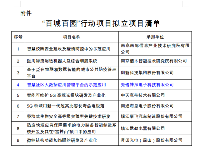 “百城百園”行動是科技部、財政部推動疫情防控、復工復產和穩定就業的重大舉措,按照《中央引導地方科技發展資金管理辦法》(財教〔2019〕129號)和《江蘇省科技計劃項目立項工作操作規程》等有關規定,經組織申報、專家咨詢、廳長辦公會票決等立項程序,無錫神探電子科技有限公司的“智慧社區大數據應用管理平臺的示范應用”項目成功入選“百城百園”行動。