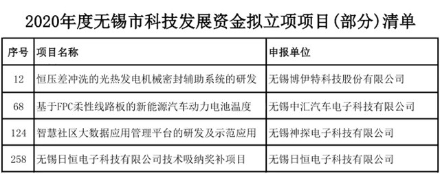 根據(jù)《關(guān)于加快實施創(chuàng)新驅(qū)動核心戰(zhàn)略的若干政策措施》(錫委發(fā)〔2017〕70號)、《關(guān)于深入實施創(chuàng)新驅(qū)動核心戰(zhàn)略加快建設(shè)科技創(chuàng)新高地的若干政策措施》(錫委發(fā)〔2018〕53號)以及《無錫市科技發(fā)展資金管理實施細(xì)則》等文件的規(guī)定,經(jīng)組織申報、形式審查、專家評審、信用查詢、黨組會審議等程序,入園企業(yè)無錫博伊特科技股份有限公司、無錫中匯汽車電子科技有限公司、無錫神探電子科技有限公司、無錫日恒電子科技有限公司的項目成功入選2020年度無錫市科技發(fā)展專項資金擬立項項目。