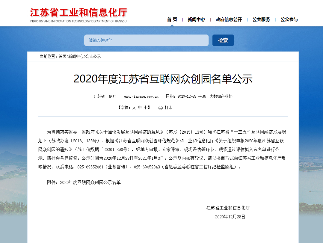 乘風(fēng)破浪 | 江蘇數(shù)字信息產(chǎn)業(yè)園獲評“2020年度江蘇省互聯(lián)網(wǎng)眾創(chuàng)園”!