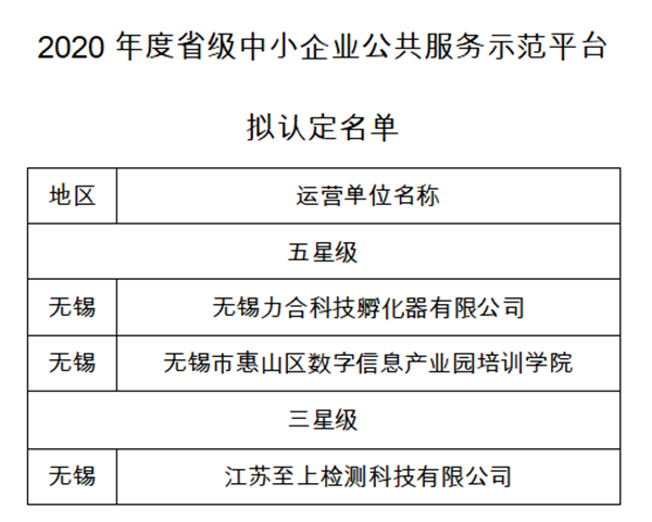 根據(jù)《江蘇省中小企業(yè)公共服務(wù)示范平臺認定管理辦法》(蘇工信規(guī)〔2020〕2號)、《關(guān)于開展2020年度中小企業(yè)公共服務(wù)示范平臺認定工作的通知》(蘇工信服建〔2020〕291號)要求,經(jīng)企業(yè)申報、各地推薦、形式審查、材料評審、現(xiàn)場核查、會議審查等程序,園區(qū)孵化服務(wù)平臺無錫力合科技孵化器有限公司、園區(qū)教育培訓(xùn)平臺無錫市惠山區(qū)數(shù)字信息產(chǎn)業(yè)園培訓(xùn)學(xué)院獲評“2020年度省級中小企業(yè)公共服務(wù)示范五星平臺”,入園企業(yè)江蘇至上檢測科技有限公司獲評“2020年度省級中小企業(yè)公共服務(wù)示范三星平臺”!