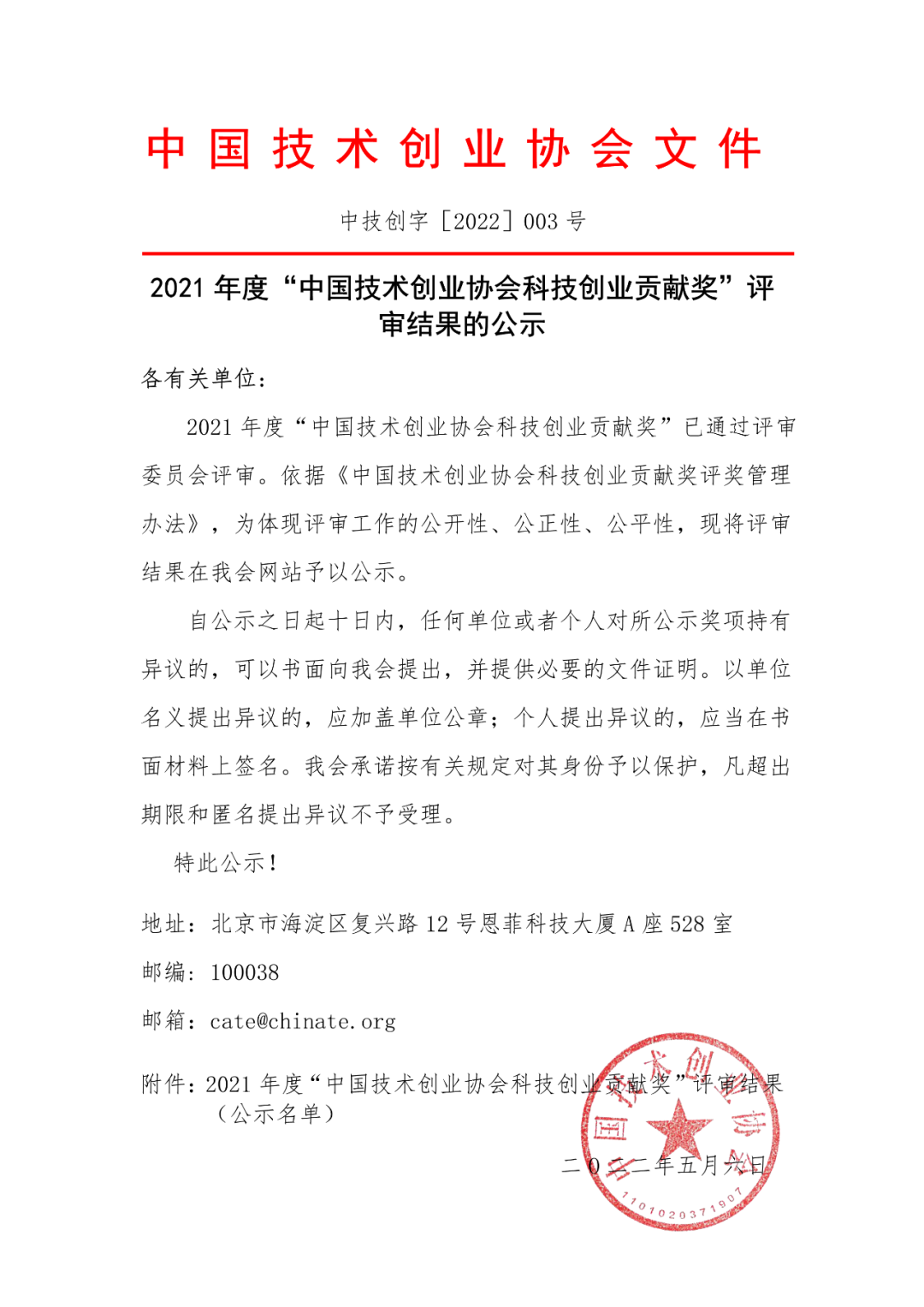 5月7日,中國技術創業協會公示了2021年度“中國技術創業協會科技創業貢獻獎”名單,力合孵化器憑借專業的企業孵化服務能力、出色的孵化成果榮獲科技創業孵化貢獻獎。