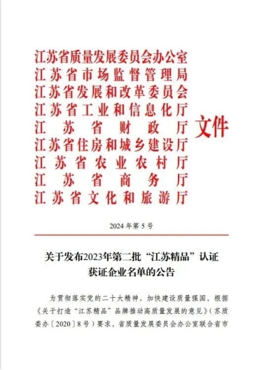 “江蘇精品”品牌認證工作于2020年啟動,是省委省政府實施創(chuàng)新驅動發(fā)展戰(zhàn)略、發(fā)展品牌經濟、推動經濟社會高質量發(fā)展的一項重要舉措,由江蘇省質量發(fā)展委員會辦公室聯(lián)合江蘇省市場監(jiān)督管理局等八個部門共同評定。“江蘇精品”是江蘇企業(yè)的區(qū)域品牌,不僅代表著高質量的江蘇產品(服務),還代表著江蘇信譽、江蘇形象、江蘇文化、江蘇實力。