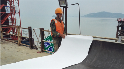 ■圖為項目施工現場工人正鋪設中水土工生產的模板布