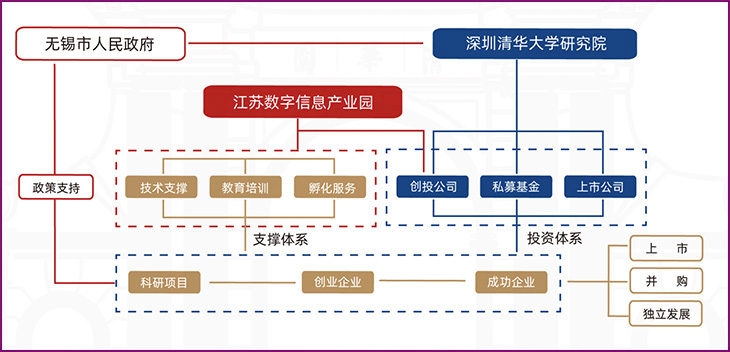 江蘇數字信息產業園坐落在美麗的太湖之畔—無錫惠山新城,由深圳清華大學研究院與無錫市政府于2008年9月合作設立,服務于清華的科技成果轉化和無錫的社會經濟發展。園區完全企業化運作,獨立運營、自籌資金、自負盈虧,是以新一代數字信息技術、智能制造、新材料新能源產業為主導的集政、產、學、研、資于一體的創新型高科技園區。十多年來,園區形成了“三大產業”、“五大核心”、“六大集聚”、“九大載體”、“十大目標”的發展格局。