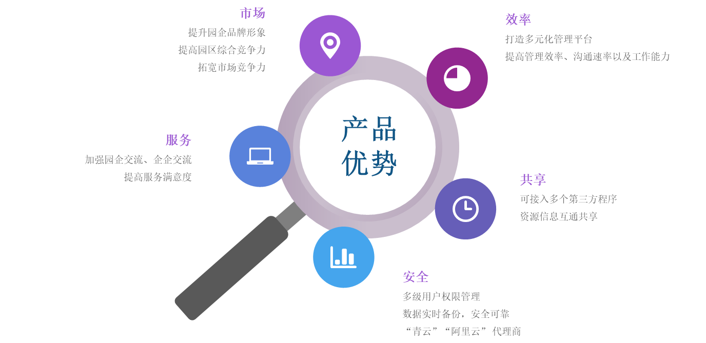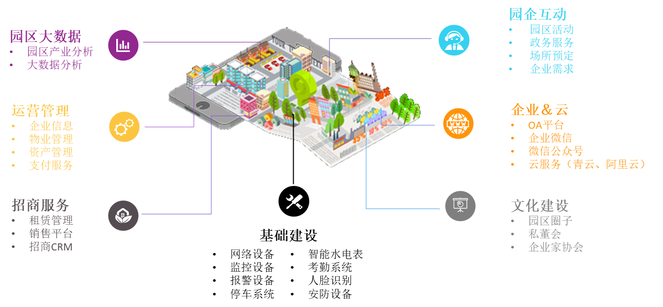 1.園區(qū)整體 貫穿園區(qū)規(guī)劃、建設(shè)、招商、運(yùn)營(yíng)各階段,為園區(qū)打造智慧的基礎(chǔ)設(shè)施、智慧的移動(dòng)端、智慧的云服務(wù),全面提升園區(qū)的競(jìng)爭(zhēng)力。